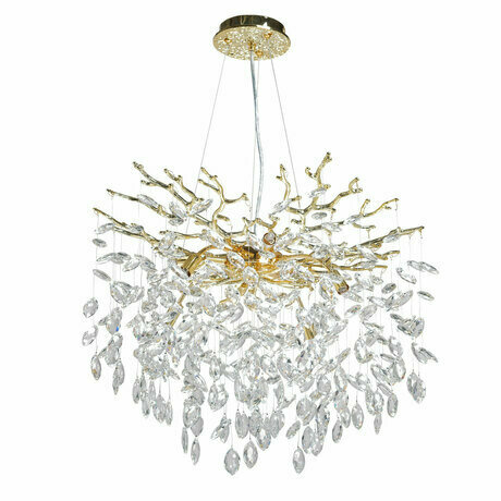 Основание подвесной люстры выполнено по технологии художественного литья из сплава алюминия с цинком и гальванизировано в цвет золота. Люстра декорирована подвесками из прозрачного хрусталя.