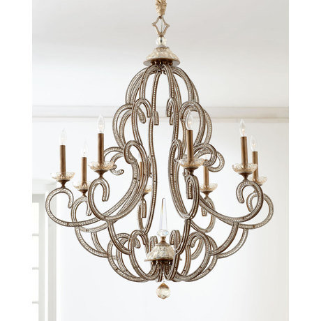 Люстра из стекла и металла смотрится воздушной и даже немного эфемерной -- за счет мягкой, прикидывающейся классической, формы и отсутствия обильных украшений. Просто восемь свечей мерцают в ажурном стеклянном облаке.