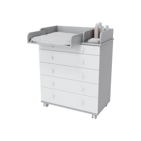 Удобный и практичный комод с пеленальным столиком представляет собой незаменимый предмет для детской комнаты. Оснащен пеленальным столиком с откидной крышкой, экономит пространство в помещении за счет удобного механизма складывания. Верхний ящик комода оснащен органайзером, обеспечивающим удобство хранения мелочей и детской косметики. Четыре вместительных ящика легко выдвигаются и задвигаются на шарикоподшипниковых направляющих, обеспечивая удобство использования. Следует отметить, что пеленальный столик можно использовать в дальнейшем в качестве дополнительной полочки под аксессуары или полностью демонтировать, продолжив использовать комод в его классическом стиле. В комплекте с комодом идут прорезиненные колеса, которые обеспечивают удобное передвижение комода во время влажной уборки комнаты. Размер пеленальной зоны 57х64см.