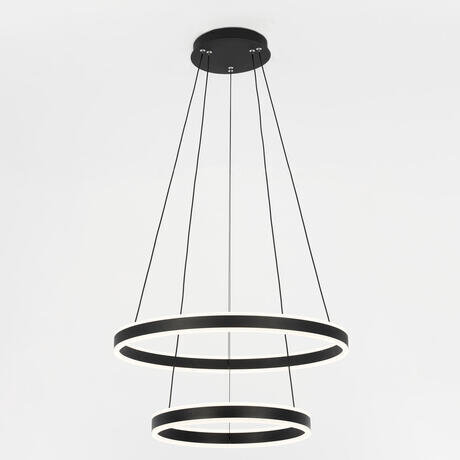 Светодиодная люстра Citilux Дуэт CL719641 выполнена в современном стиле. Чёрная люстра на тросах с двумя подвесными кольцами, высоту и угол наклона каждого из которых можно легко изменить. Кольца - светодиодные модули изготовлены из алюминиевого профиля, рассеиватель из оптического полимера. Наличие источников света с двух сторон профиля позволяет равномерно осветить всё помещение.