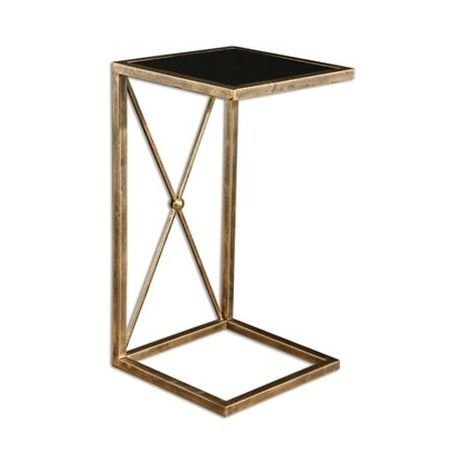 Совершенно необычный и оригинальный приставной столик от производителя Uttermost. У столика яркая металлическая основа в золотой отделке и черная стеклянная столешница.
